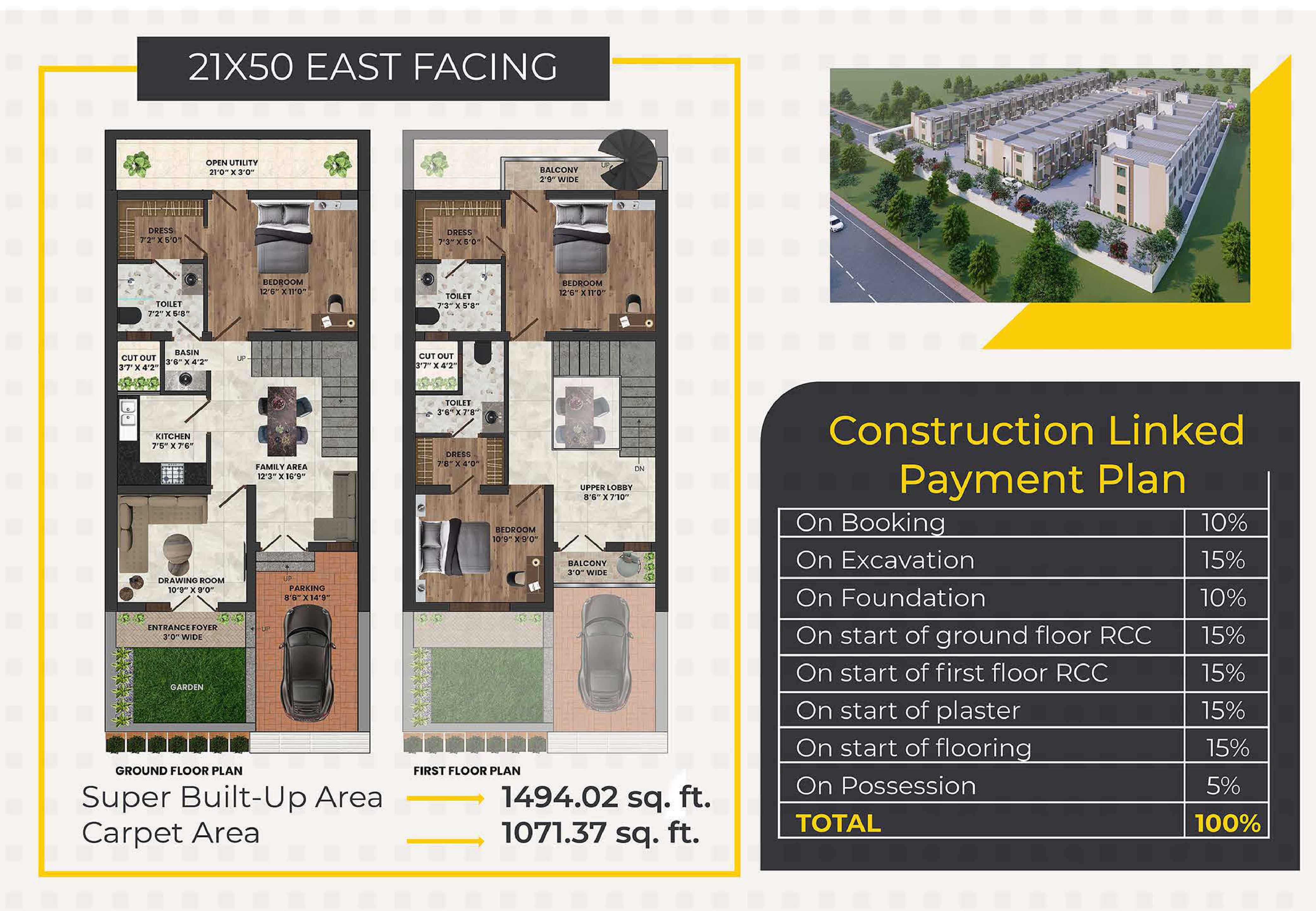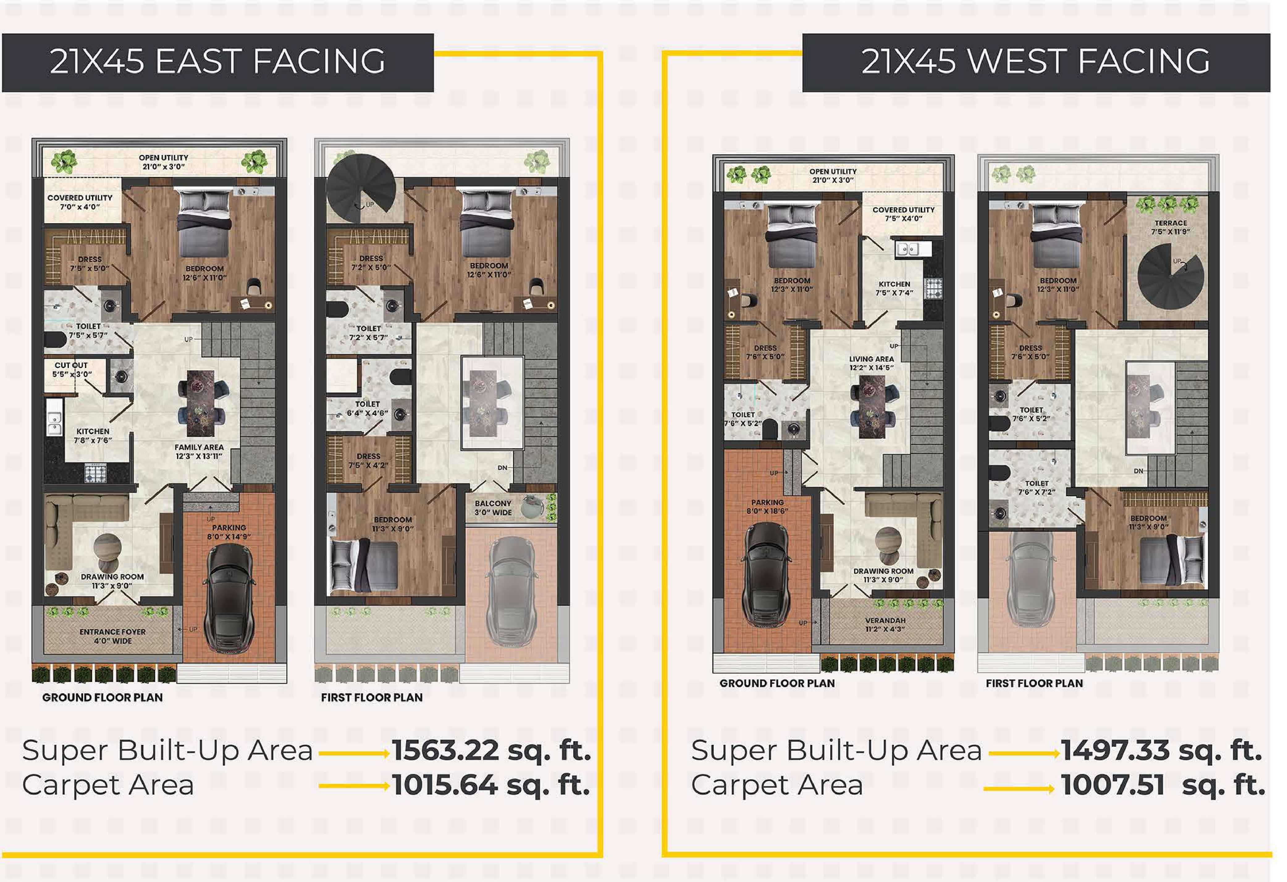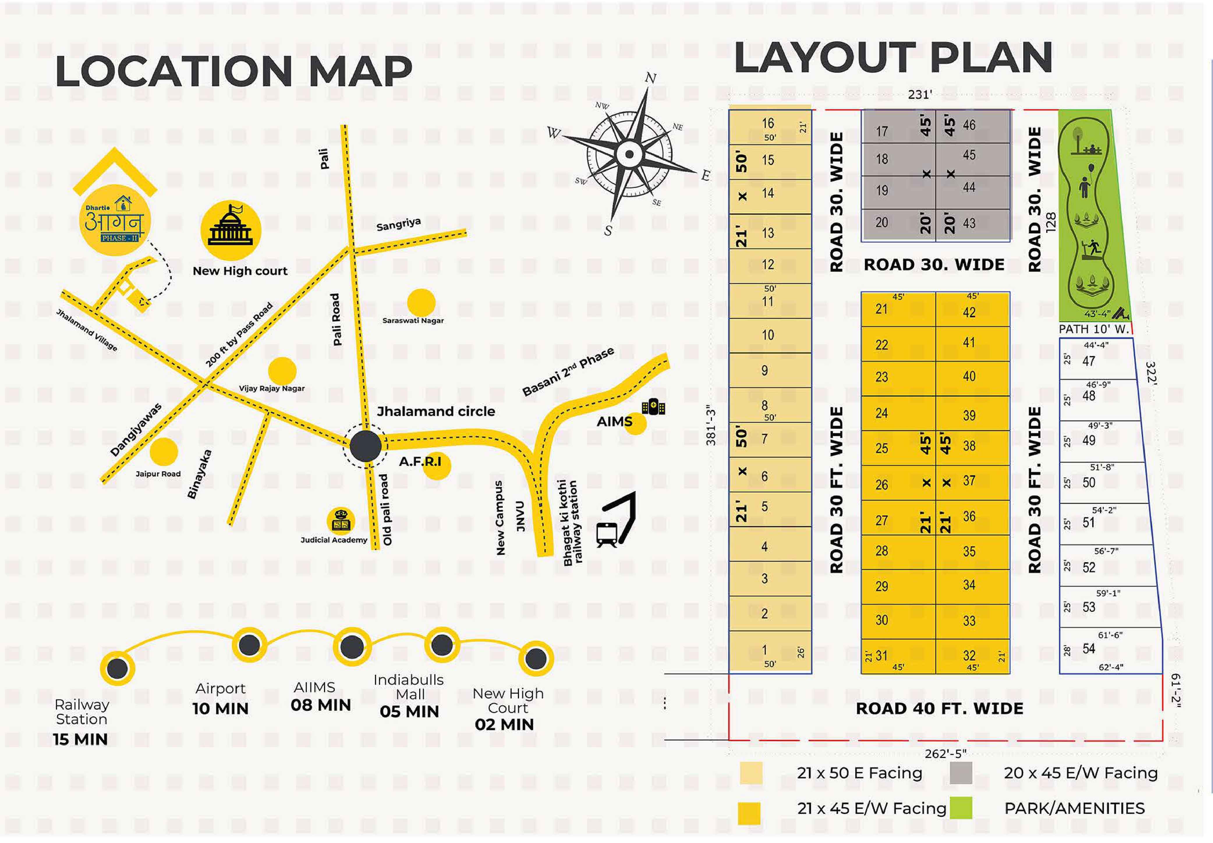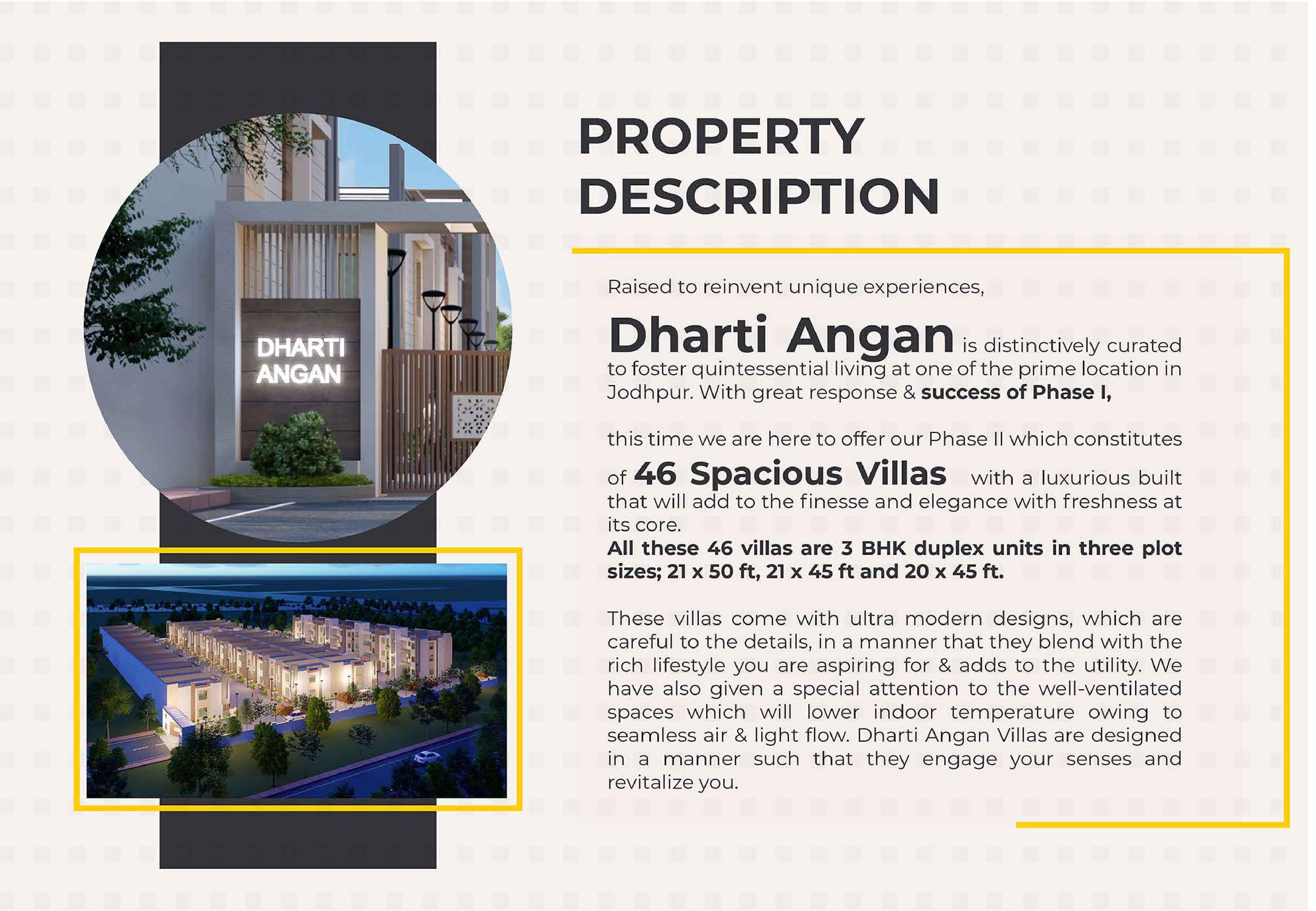 Dharti Angan is a premium residential project in Jodhpur offering 46 spacious 3BHK duplex villas in three plot sizes – 21x50 ft, 21x45 ft, and 20x45 ft. Designed with modern architecture and attention to detail, these villas provide a luxurious living experience. The homes are well-ventilated for natural light and air flow, ensuring comfort and lower indoor temperatures. Dharti Angan aims to blend elegance with functionality, creating a space that revitalizes and engages your senses.